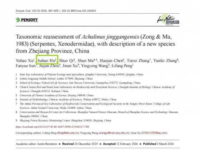 3月3日晚间,浙江临海高三学生胡家豪在一又友圈晒出了海外期刊《Zoosystematics and Evolution》簇新出炉的一篇论文截图,论文本色是浙江临海发现的爬步履物新物种——括苍山峰蛇。