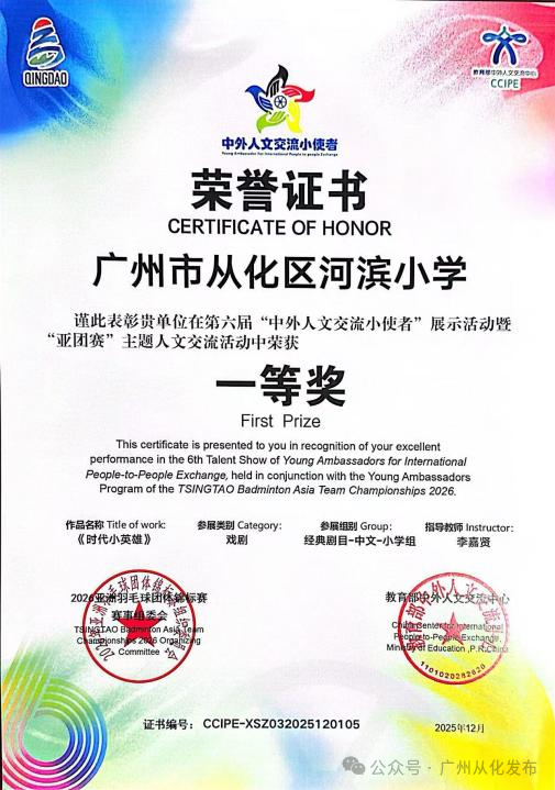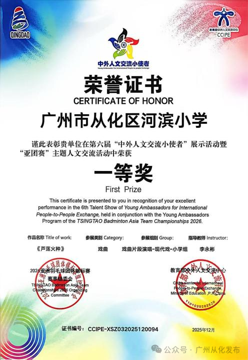 近日,广州市从化区河边小学收到了两份千里甸甸的荣誉文凭。在北京举行的第六届“中外东谈主文调换小使臣”寰宇总展示步履中,河边小学凭借《芦荡火种》《期间小强者》两个杰作节目脱颖而出,一举斩获寰宇一等奖!