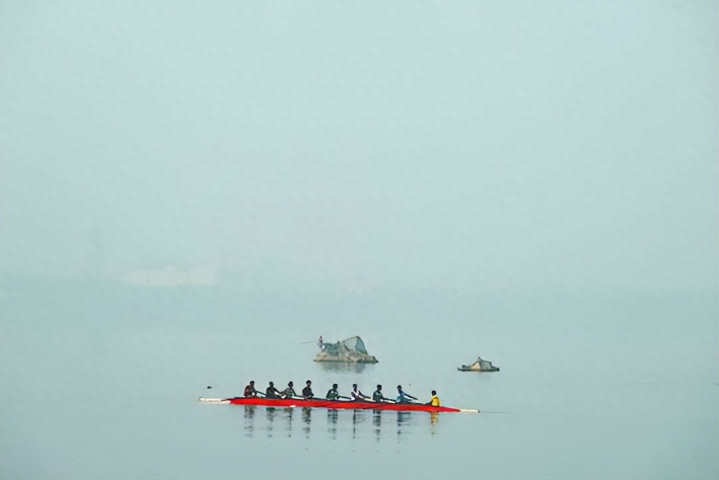 赛艇运动员在雾霾笼罩的印度侯赛因萨加尔湖上训练。
