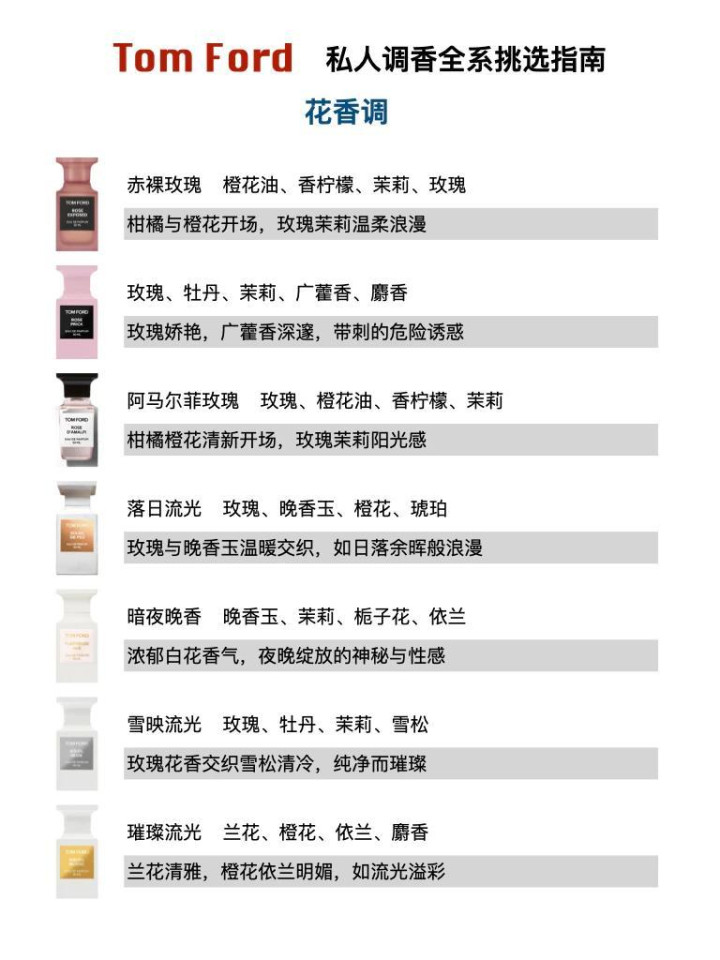 Tom Ford 的花香调,从来不是甜腻的仙女香,而是把玫瑰、晚香玉等经典花香,作念出了高档感与端倪感,温暖中带效劳量,甜而不齁,贵而不艳。