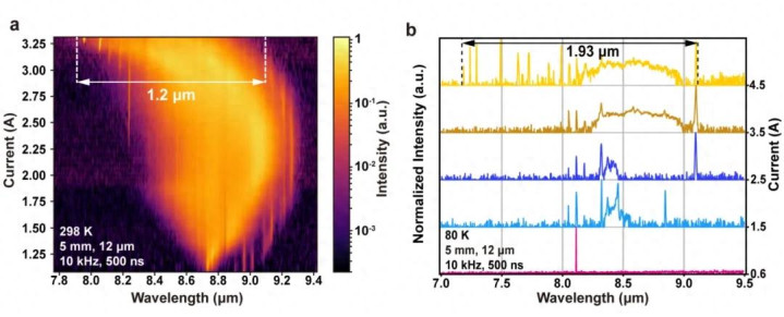 本质适度自大,在室温条款下,该器件在约9μm(微米,下同)波段(中红外畛域)终透露1.2μm的激光谱宽;在低温环境下,光谱宽度进一步扩大至1.9μm以上,同期光电同样适度等中枢方针已接近国外普及水平。