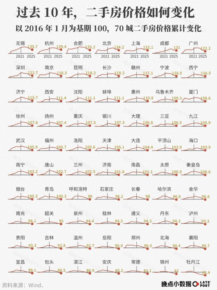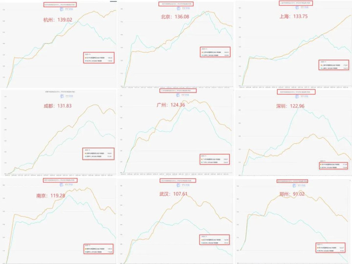 44城中,“抗跌主力”是无锡、杭州、合肥、北京、上海、成都、广州、深圳,其房价相较十年前还有20个基点以上的差值。