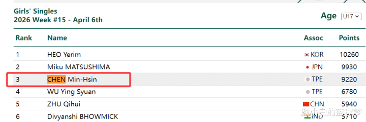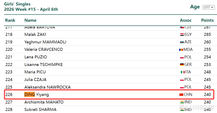 16岁的丁一洋在U17女单的世界排行只是226位,不错说她这个排行很是低,要知说念她决赛的敌手陈忞昕在U17女单的世界排行第三。