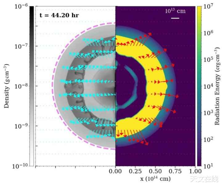 该图展示了质地为20倍太阳质地的红超巨星(RSG)在激波打破恒星名义之前的结构。这是激波抵达恒星名义之前、激波打破发生前陡然时候的气体能量密度与放射能量密度快照。在激波前线会酿成热烈的放射前驱区,作家讲明说念。青色箭头流露物资速率,红色箭头流露放射通量。粉红色虚线代表扩展的光球层,该光球层会使激波打破进程变暗并减缓其程度。大气层的膨大速率远小于激波速率,作家讲明说念。图片版权:ASIAA/陈文义