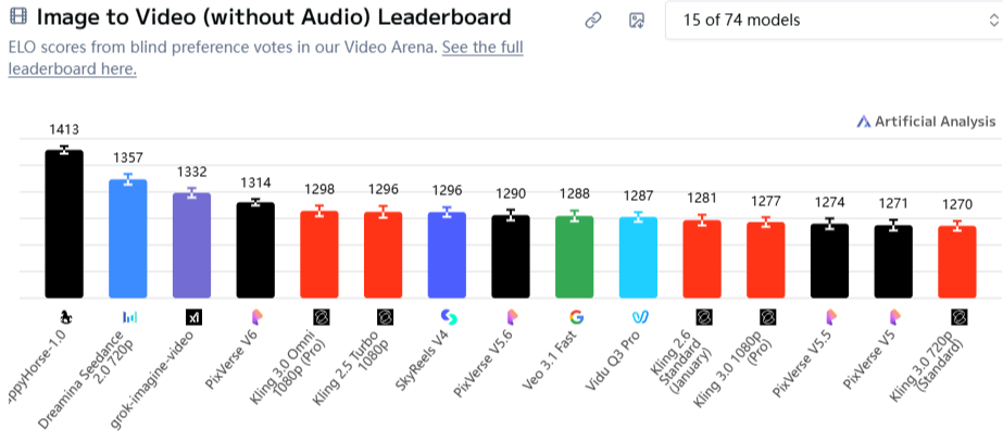 尤其是文本生成视频(不含音频)赛说念,HappyHorse得分1383,比排行第二的Seedance高出110分;图片生成视频(不含音频)赛说念,HappyHorse得分高达1413分,刷新该榜单记录。