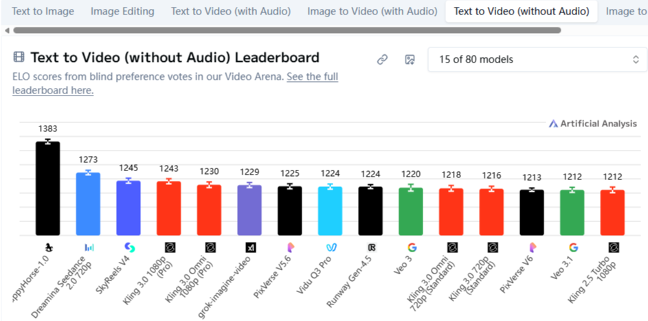 达成发稿,在Artificial Analysis平台的文本生成视频(含音频/不含音频)、图片生成视频(含音频/不含音频)四个限制中,HappyHorse的ELO得分均排行第一,全面高出了字节朝上推出的Seedance 2.0、昆仑万维的SkyReels V4以及可灵AI 3.0等热点视频生成模子。