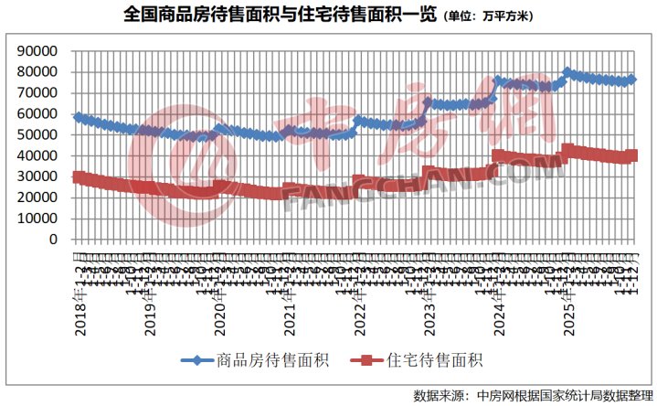 商品房库存方面,攀升态势明显趋弱。截至2025年末,商品房待售面积76632万平方米,比上年末增长1.6%,比11月末回落1.0个百分点。其中,住宅待售面积20236万平方米,增长2.8%。